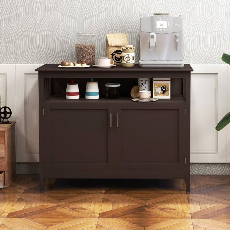• Dark Brown Wood 2-Door Dining Buffet Sideboard Cabinet with Open Storage Shelf